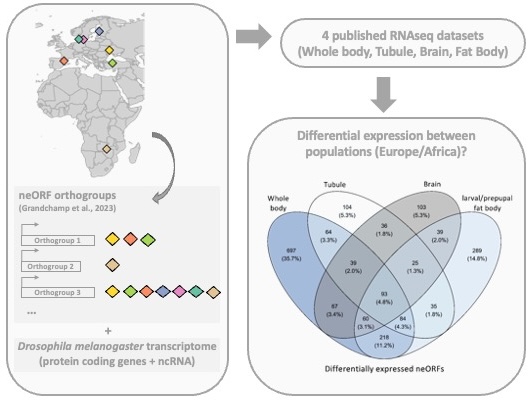 Together with the Parsch lab , we studied the expression of neORFs (newly evolved expressed ORFs) in Drosophila populations, in comparison to protein-coding genes and ncRNA. We used publicly available RNA-seq data, including whole-bodies, two adult tissues, and three larval/developmental stages from a single tissue. We found that about half of the previously detected neORFs were expressed in each dataset and show greater expression divergence between populations than protein-coding genes or ncRNA. In contrast, we observe less sex-biased expression in neORFs compared to the other two gene classes. Notably, the highest number of sex biased neORFs was detected in the whole-body samples, which might be explained by the presence of the gonads. Finally, we found that neORFs shared between multiple lines in the original dataset were more likely to be (differentially) expressed in the four studied datasets, suggesting that they are more likely to be functional.